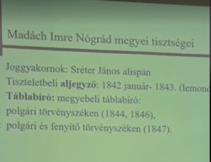 Dr. Diószegi Szabó Pál A ”Nappali” Madách, egy küzdelmes út a reformkortól a Bach korszakig. Nógrád vármegyétől az országgyűlési képviselőségig témájú előadásában Madách Imre kevésbé ismert munkásságáról beszélt.